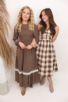 Sweet and structured, our Plaid Tie-Back Dress blends classic fall patterns with a modern, flattering silhouette. Designed in a warm brown plaid with subtle texture, this sleeveless dress features a fitted bodice, flared skirt, and an adjustable tie-back detail that cinches perfectly at the waist. Throw on a turtleneck or long sleeve underneath for a cozy, preppy fall look that’s equal parts cute and comfortable!