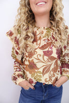 Burgundy & Rust Floral Ruffle Shoulder Top