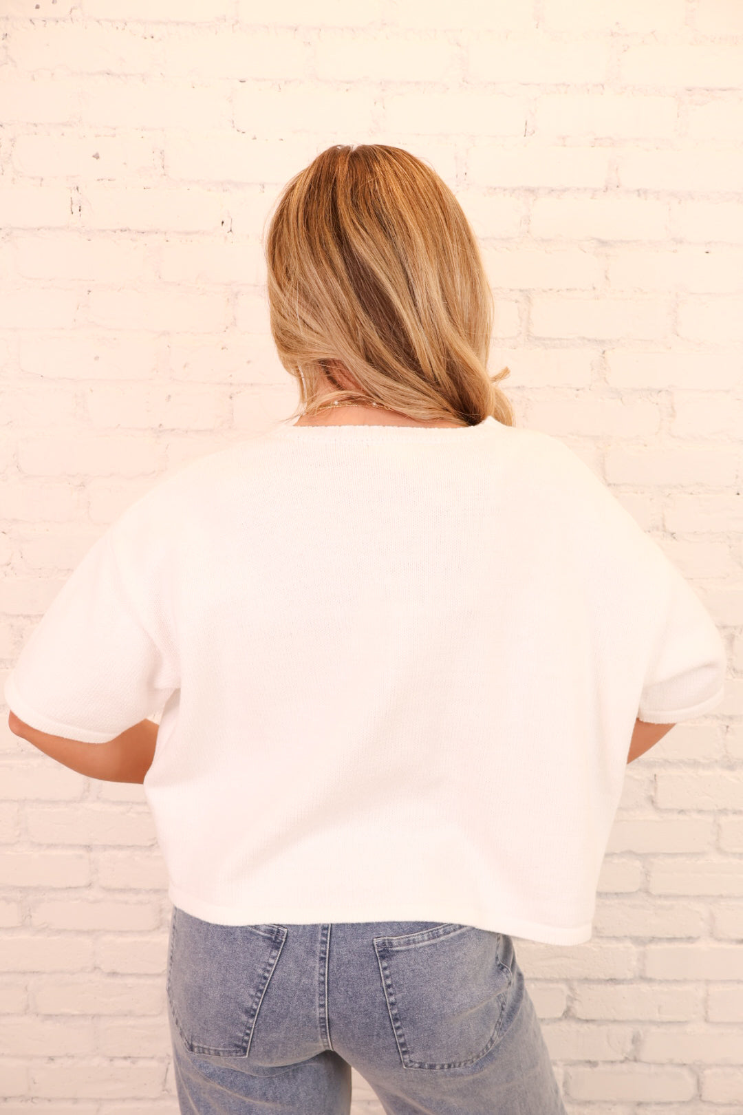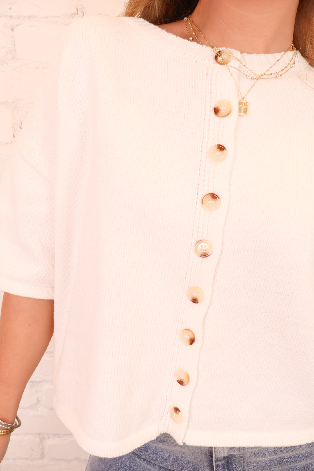 Short Sleeve Button Front Knit Top - White