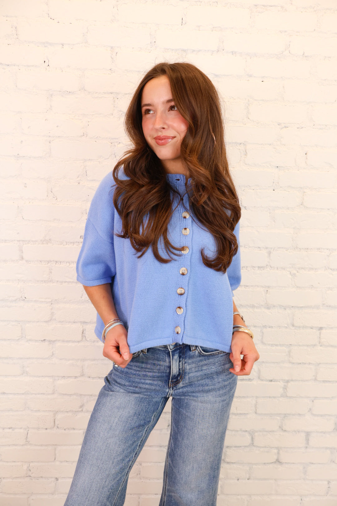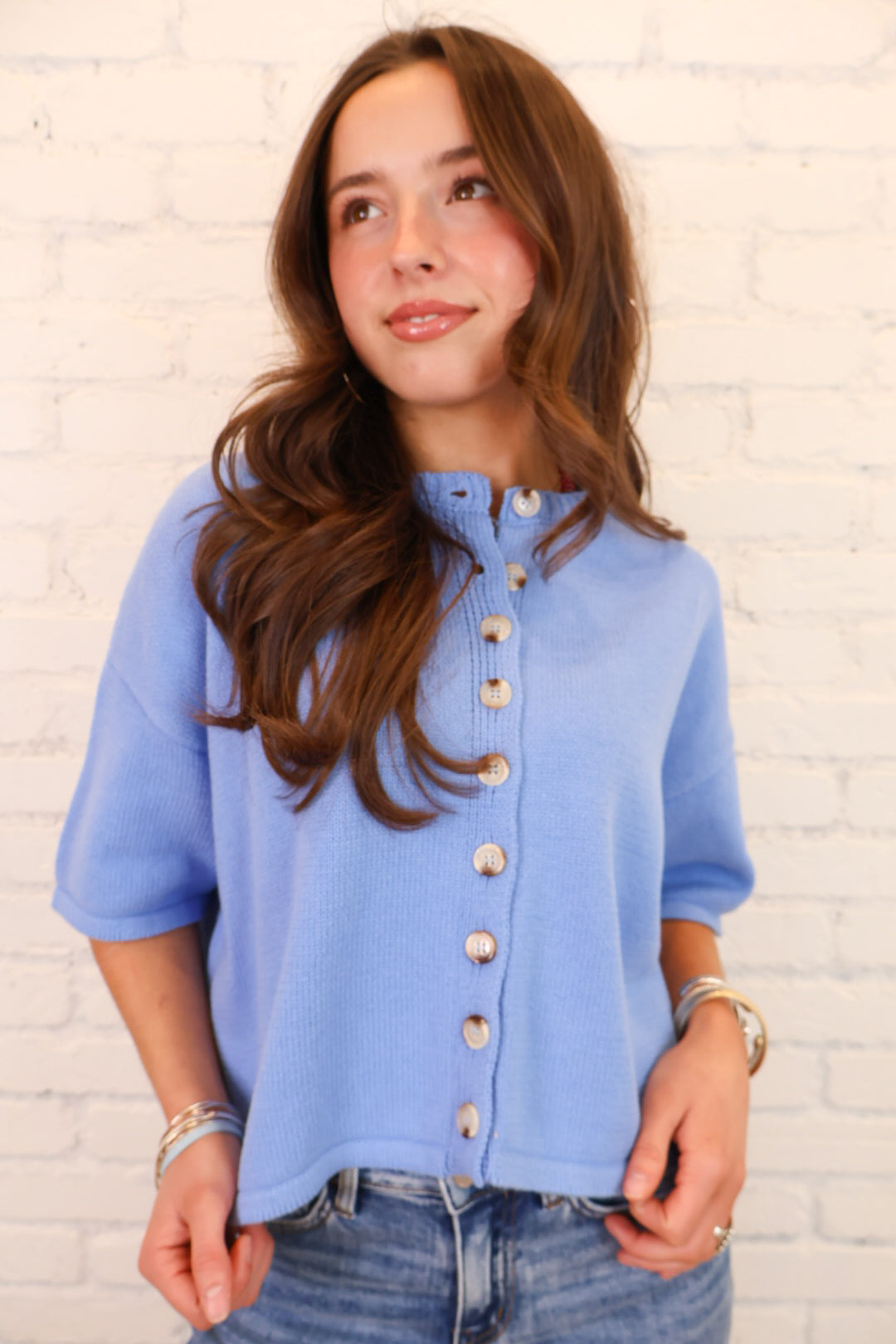 Short Sleeve Button Front Knit Top - Blue