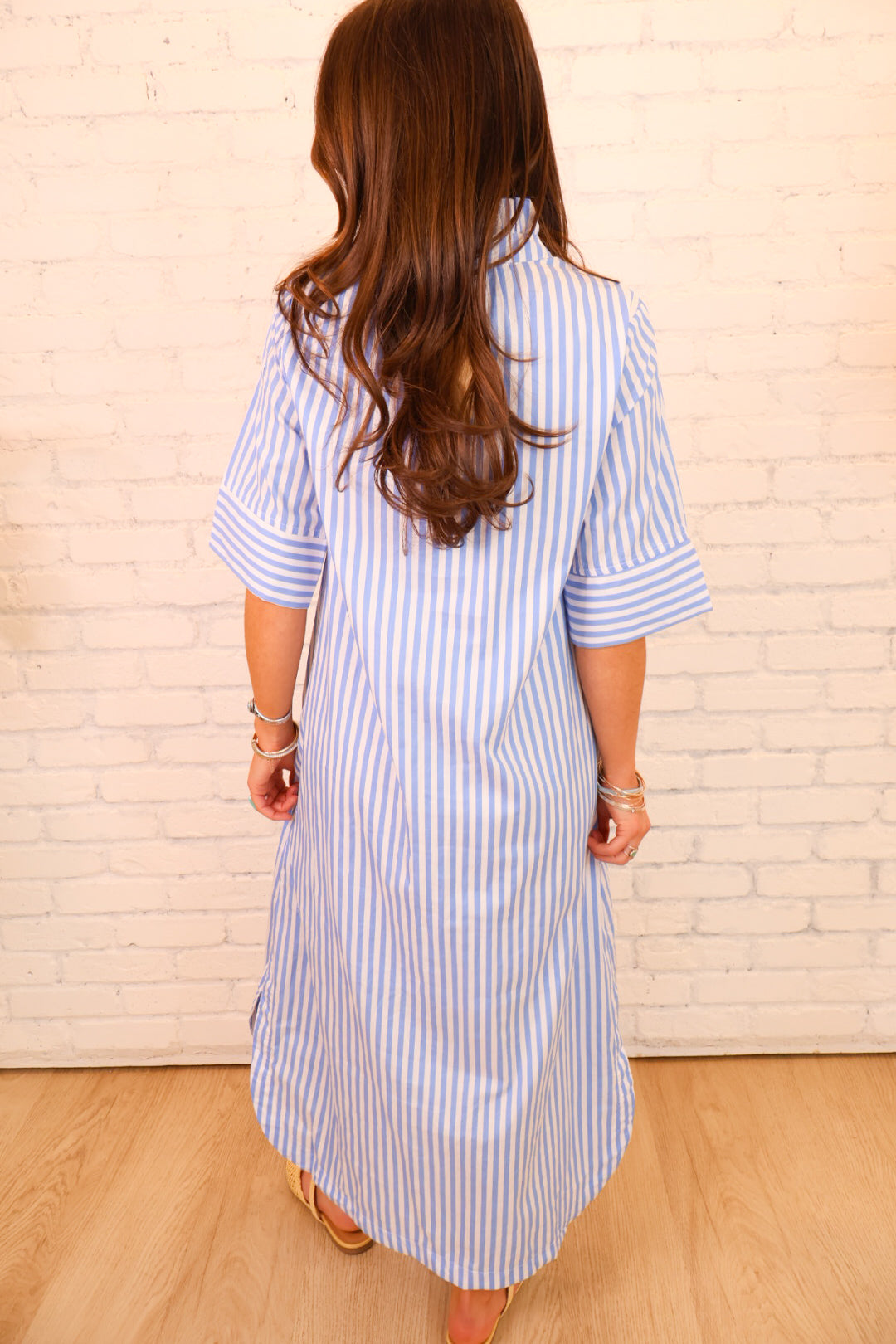 Blue & White Striped Button Front Midi Dress