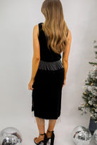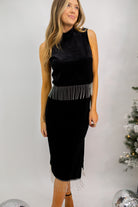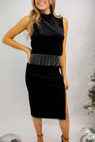 Stand out at your next event in our black velvet top and skirt set! Adorned with rhinestone fringe along the hem of both the top and skirt, This luxe set is just what you need to stand out.