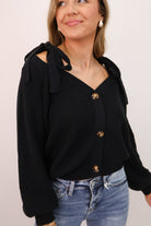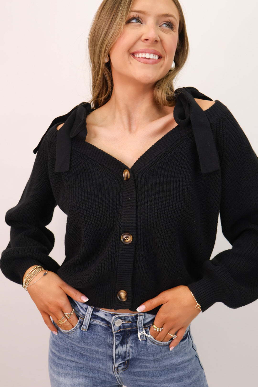 Unleash your bold and confident side with our stylish shoulder tie black sweater! Featuring an open shoulder with adjustable shoulder ties and a functional button front, this cozy sweater is the perfect blend of fashion and functionality. Make a statement and turn heads with this must-have addition to your wardrobe!
