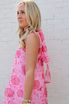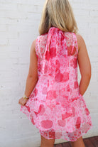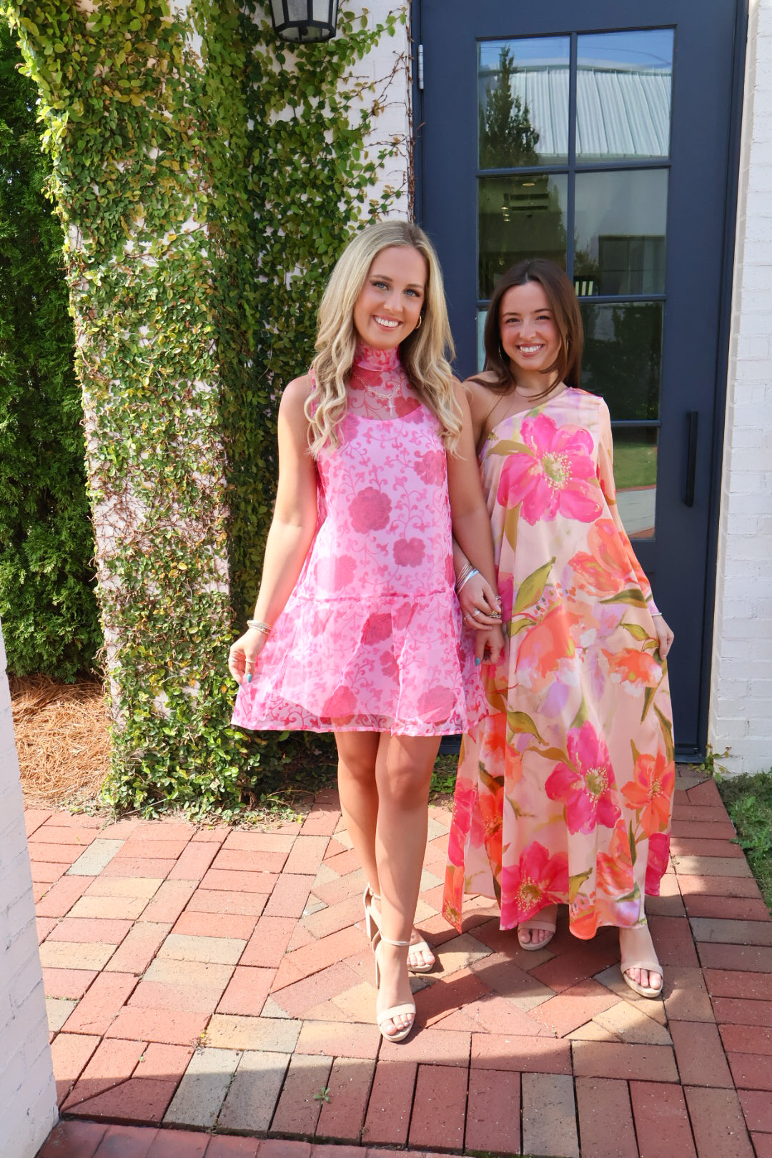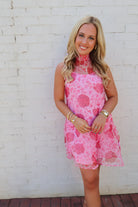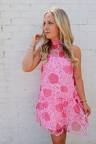 If you’re looking for something flirty, feminine, and just a little bit different—this is it! This high neck mini features the prettiest tonal floral pattern in shades of pink, layered over a lightweight sheer fabric for a soft, romantic feel. The relaxed fit and subtle drop waist give it that easy, throw-on-and-go vibe while still feeling elevated enough for any special occasion.