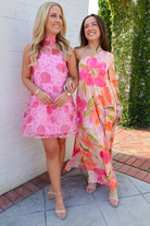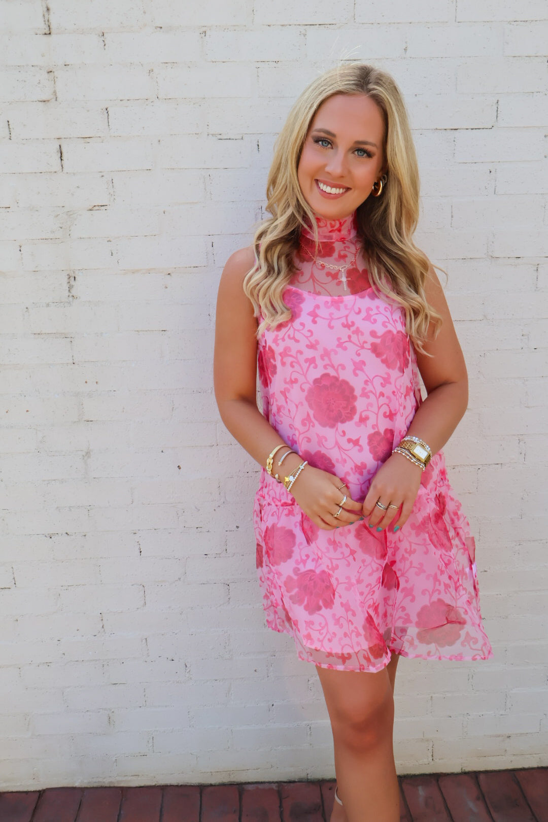 pink mini dress, floral mini dress, high neck dress, bridal shower dress, graduation dress, spring mini dress, feminine dresses, sheer overlay dress, summer event dress