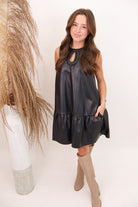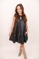 Sleek, structured, and effortlessly striking — our Black Faux Leather Flounce Hem Dress brings the perfect blend of edgy and feminine to your fall wardrobe. Made from buttery-soft faux leather with a subtle sheen, this dress features a fitted bodice that falls into a playful flounce hem for just the right amount of movement. Whether you’re headed to a fall dinner party, concert, or holiday event, this one guarantees compliments!