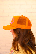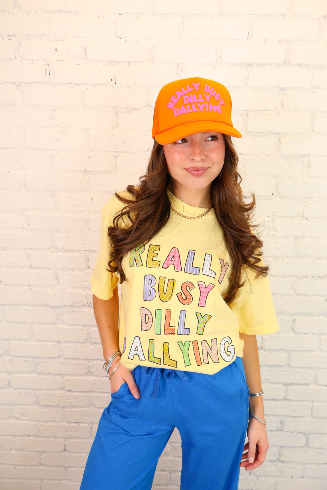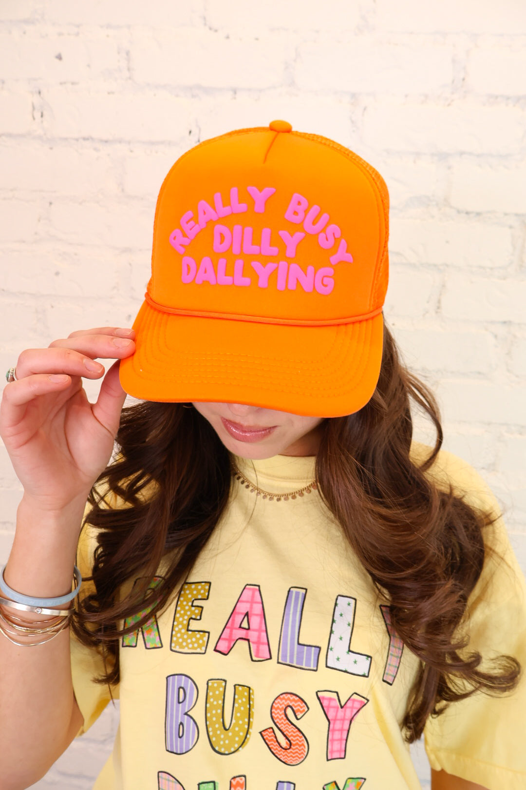 This trucker hat is made for bold personalities and busy (but fun) days. Featuring a bright orange crown and bill, this hat instantly stands out, while the hot pink raised lettering across the front reads “REALLY BUSY DILLY DALLYING”for a playful, tongue-in-cheek vibe we’re obsessed with.
