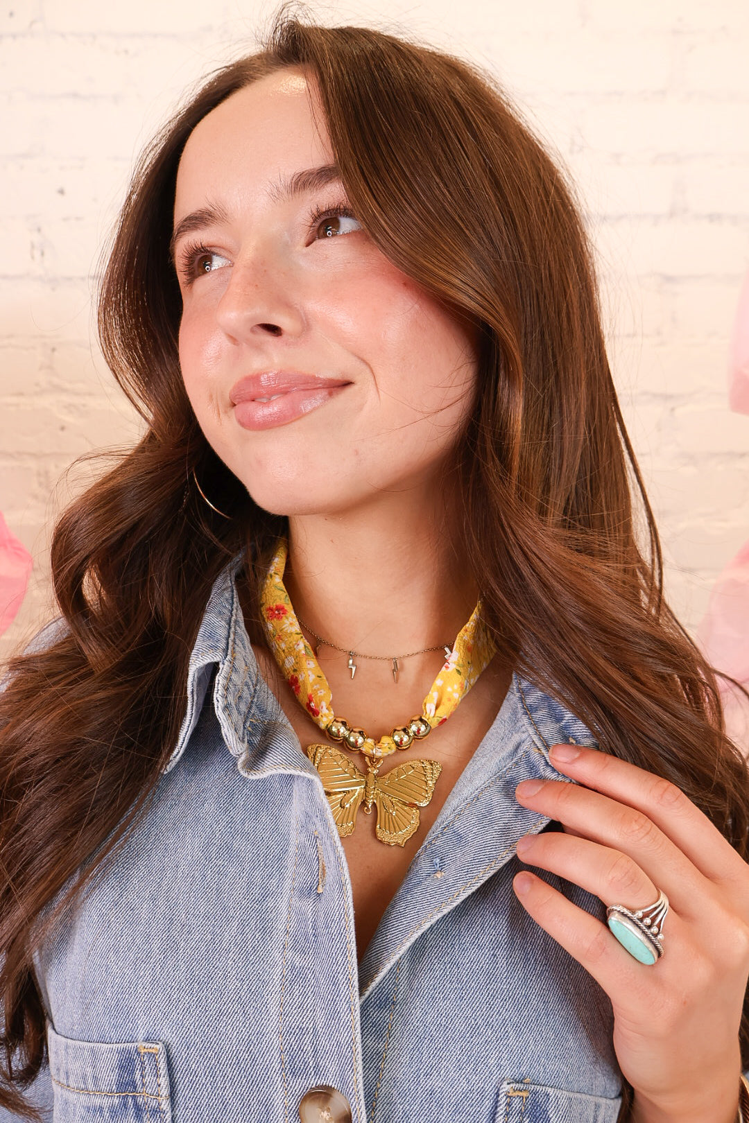 This gold butterfly scarf necklace is such a fun statement piece! Featuring a soft fabric scarf-style band with gold bead accents and a bold butterfly charm, this necklace instantly elevates any outfit. It’s lightweight, eye-catching, and easy to style with everything from denim to dresses.