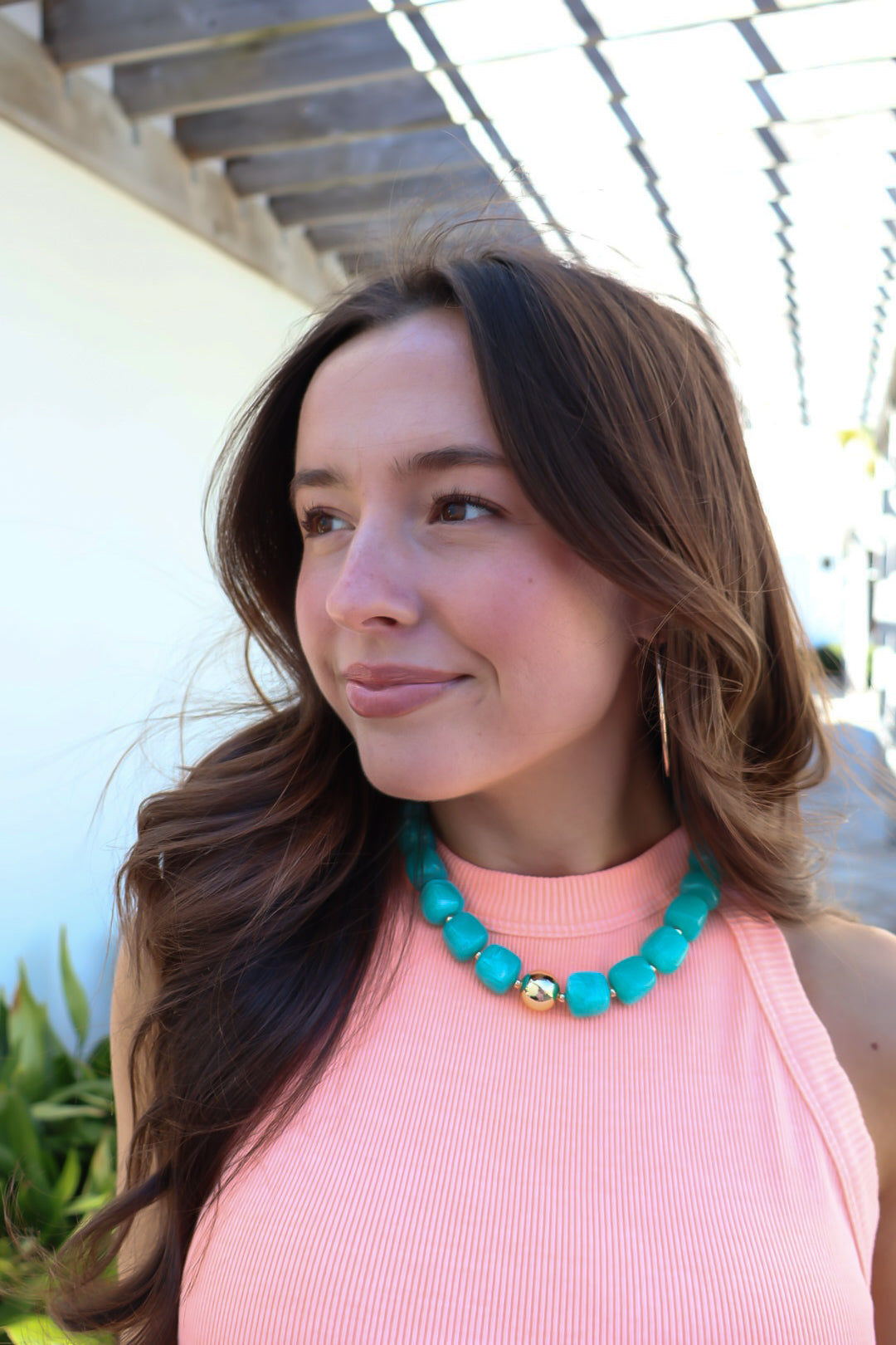 Bold turquoise statement beads with a gold accent bead at the center. It’s chunky but still refined — the kind of piece that instantly elevates a simple neckline.