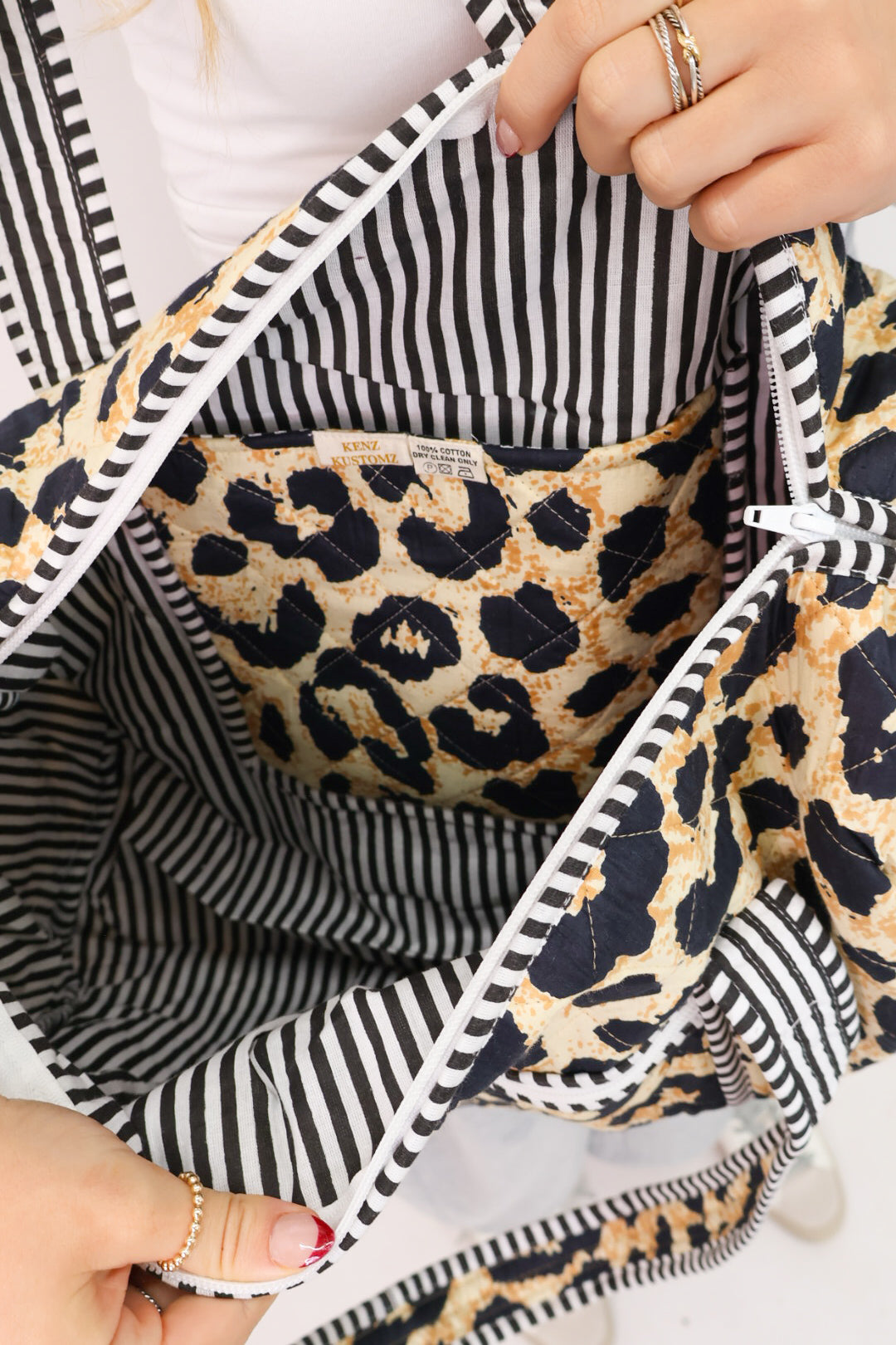- Quilted leopard print with striped trim