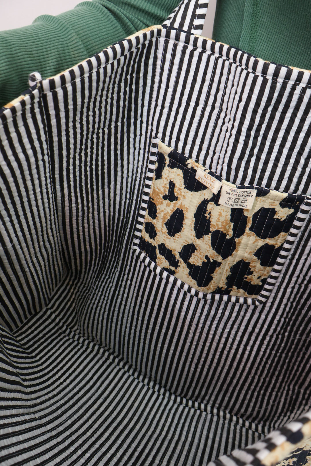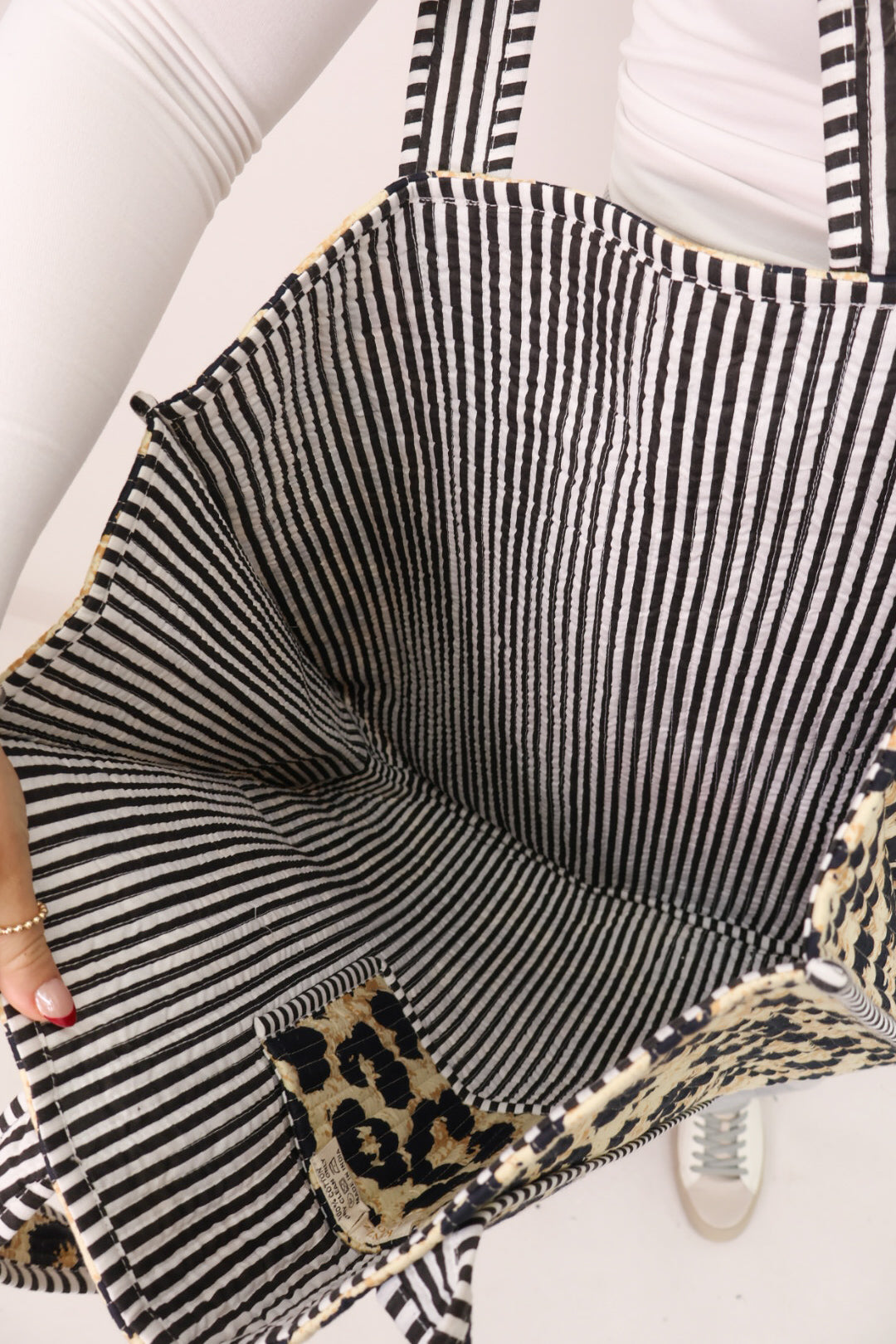 The Quilted Leopard Tote Bag is that perfect blend of bold and practical. Featuring a quilted leopard print design trimmed in black-and-white stripes, it’s roomy enough for all your essentials without feeling bulky. The open top and soft structured shape make it easy to carry — whether you’re running errands, heading to work, or jetting off for the weekend.