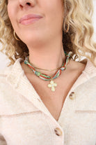 Add a fresh pop of color to your accessories collection with this green scarf necklace. Designed with earthy tones of green and brown, it’s finished with a gold cross pendant accented by delicate pearl-like details. A versatile piece that can go casual or dressy.