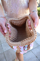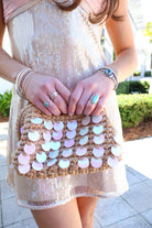 This bag is pure happy energy! Handwoven with chunky fabric detailing and covered in oversized iridescent sequins, it’s the statement piece your outfit didn’t know it needed. The structured top handle makes it easy to carry, and the interior is roomy enough for your phone, wallet, gloss, and keys.