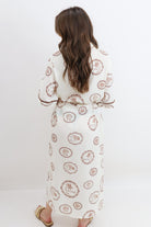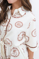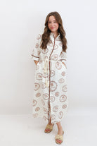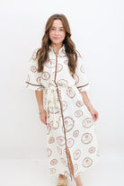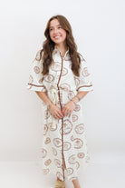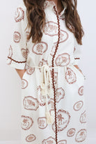 Say Ciao to your new vacation favorite. This shirt dress brings major European charm with its creamy base and rich terracotta-toned island stamps featuring shells, palms, and tropical emblems. The relaxed, midi-length silhouette is effortlessly flattering, with a drawstring rope waist that lets you adjust the fit to your vibe. It’s finished with scalloped trim and a soft button-down front, making it a dreamy option for everything from lunch al fresco to coastal strolls.