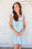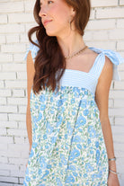 Playful, breezy, and made for mingling—this dress was made for your next garden party or sunny weekend brunch. Featuring a dreamy mix of powder blue florals and classic blue-and-white stripes, this babydoll mini is all about sweet details. The self-tie shoulder straps let you adjust the fit to your liking, while the striped yoke adds that little extra pop we all love. The silhouette is loose, flowy, and insanely comfortable without sacrificing style.