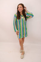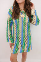 Add a pop of color to your beach days with this blue, taupe, and green striped crochet coverup dress. Featuring an open weave design, this dress is perfect for layering over your swimsuit. For extra coverage, pair it with a slip underneath, or style it casually with your favorite denim shorts. The bell sleeves add a playful, boho touch to the relaxed, breezy fit. Whether you're lounging by the pool or grabbing lunch at the beach bar, this dress is the ultimate way to elevate your vacation style.