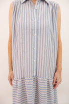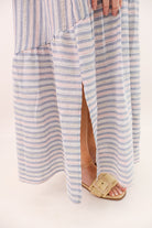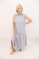 Featuring vertical stripes in soft shades of blue and blush, this sleeveless button-front maxi dress is equal parts classic and effortless. The collared neckline gives it a slightly tailored vibe, while the relaxed drop waist and flowy tiered hemline keep it casual and chic. The subtle side slits add a little movement and just the right amount of sass.