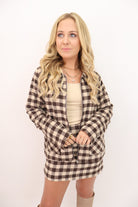 Classic, cozy, and oh-so-chic — our Plaid Jacket and Skirt Set is giving elevated fall energy! Designed in a timeless chocolate and cream check pattern, this matching jacket and mini skirt duo delivers just the right mix of polished and playful. The zip-front jacket keeps things casual and cool, while the fitted mini skirt adds a flirty touch that’s perfect for everything from Friendsgiving brunch to a night out!
