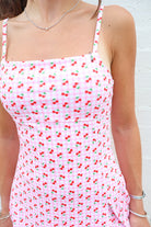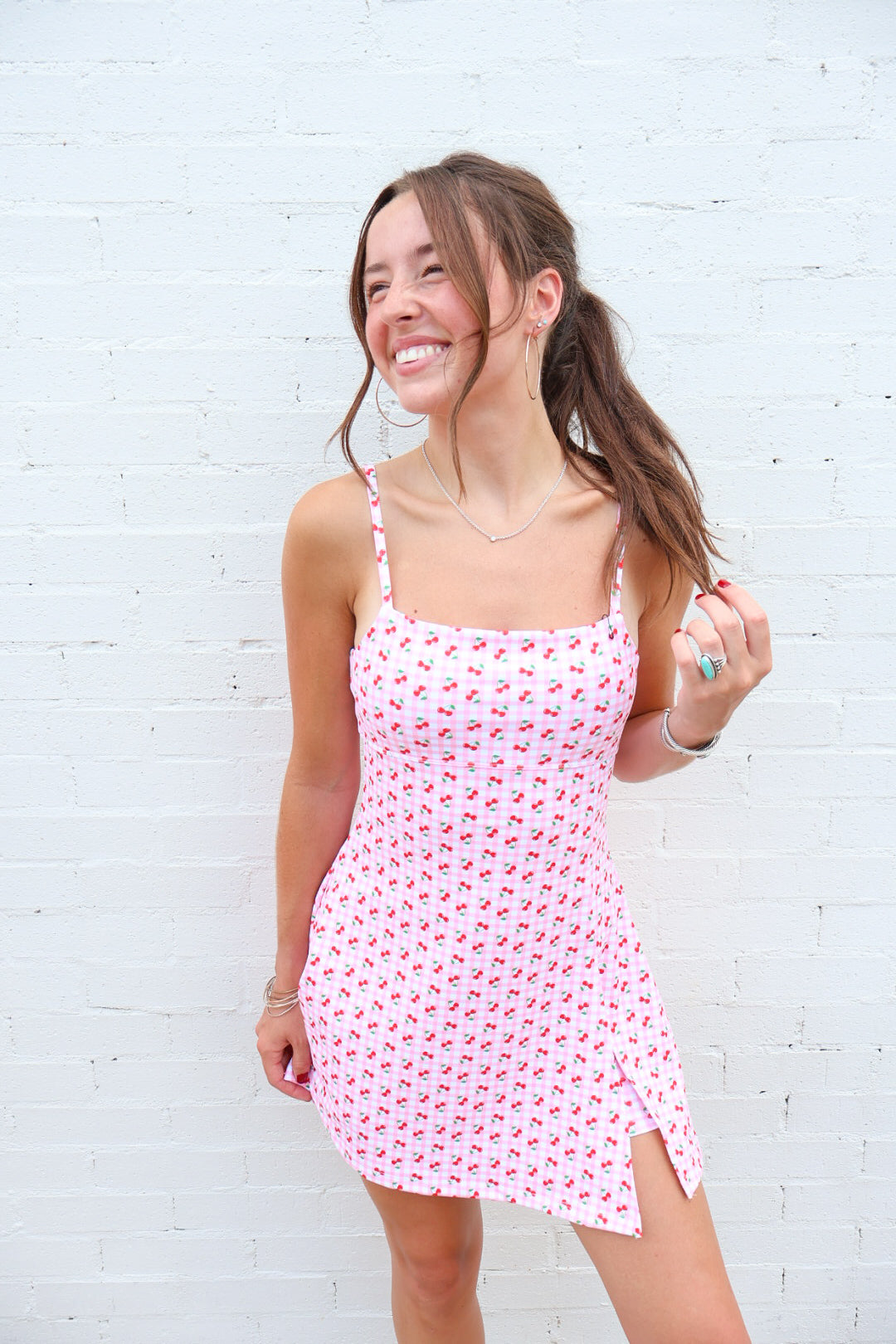 A dress so cute and functional? Yes, please. Our Cherry On Top Athletic Dress is what summer dreams are made of. This playful activewear-inspired style features an allover cherry print on pink gingham with a body-hugging fit through the bodice, a flirty side slit, and the best part—built-in shorts underneath so you can move with total confidence. The back cutout adds a sweet and sporty surprise, while the stretchy performance fabric keeps things cool, comfy, and ready for anything on your calendar—from tennis matches to coffee dates.