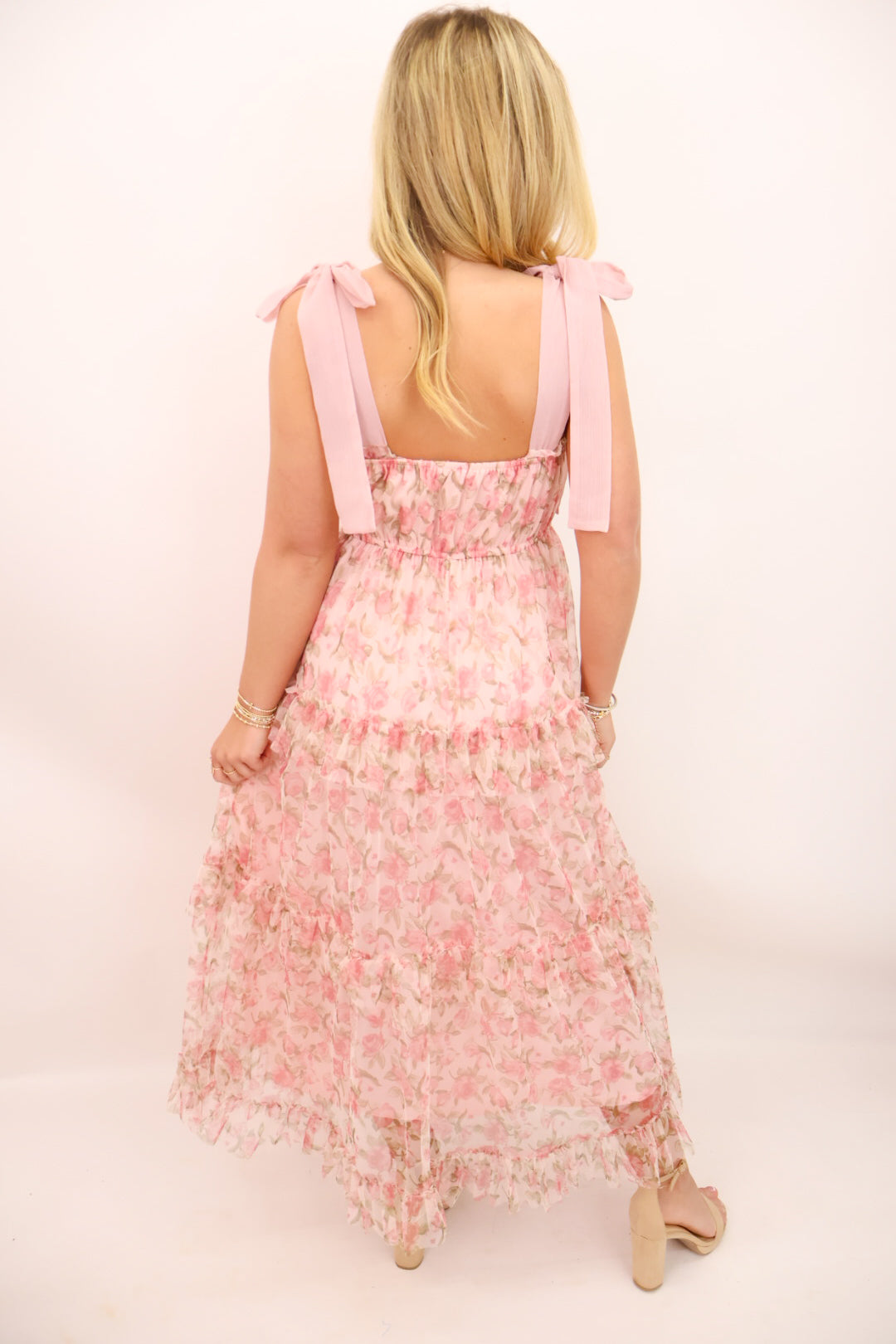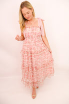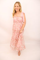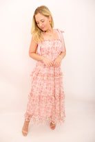 Breezy, beautiful, and oh-so-romantic, our Chiffon Floral Maxi Dress is the perfect statement piece for spring and summer. Designed with a lightweight chiffon fabric, this dress features a tiered maxi skirt that creates stunning movement with every step. The decorative shoulder ties add a touch of feminine charm, while the elastic waist ensures a comfortable and flattering fit. Whether you're heading to a wedding, bridal shower, baby shower, garden party, or tropical getaway, this dress is a dreamy choice for any special occasion.