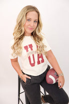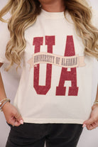 Classic, bold, and always in style — our Banner UA Tee is a must for every Crimson Tide fan. This cropped ivory Comfort Colors tee features a vintage-inspired UA block graphic with a soft banner across the front that reads “University of Alabama.” It’s the kind of tee that looks just as good cheering in Bryant-Denny as it does running errands around town. Pair it with our wide leg sweatpants or joggers for a relaxed game day look you’ll wear on repeat.