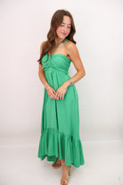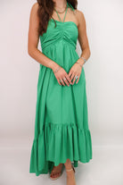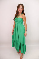 SEO Keywords: green halter maxi dress, summer beach dress, vacation outfit, smocked back maxi dress, ruffle hem dress, lightweight travel dress, resort wear, tropical getaway look, tiered green maxi