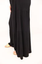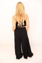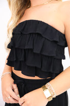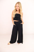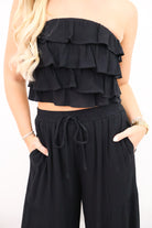 black gauze set, tiered ruffle tube top and wide leg pants, vacation matching set, coastal summer outfit, strapless set with smocked back, beach dinner outfit idea, comfy chic set, casual summer set