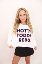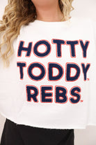 Show your Rebel spirit in style with this cropped crewneck, the perfect mix of casual comfort and gameday flair. Designed with a relaxed fit and raw hem, it gives that laid-back yet girly vibe you’ll reach for again and again. The bold chenille "Hotty Toddy Rebs" lettering makes it a standout piece, while the lightweight cotton-blend fabric keeps it easy to wear from tailgate to kickoff. Pair it with denim shorts and cowboy boots for gameday, or style it with leggings and sneakers for an everyday look that still reps your team.