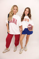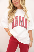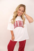 Big game energy, extra comfy fit. This oversized Husky brand tee features bold crimson 'BAMA' block lettering across the chest on a soft white base. It's long enough for bike shorts, roomy enough to lounge in, and 100% gameday approved. Pair with our washed joggers or wide leg pants for the ultimate relaxed fan fit!
