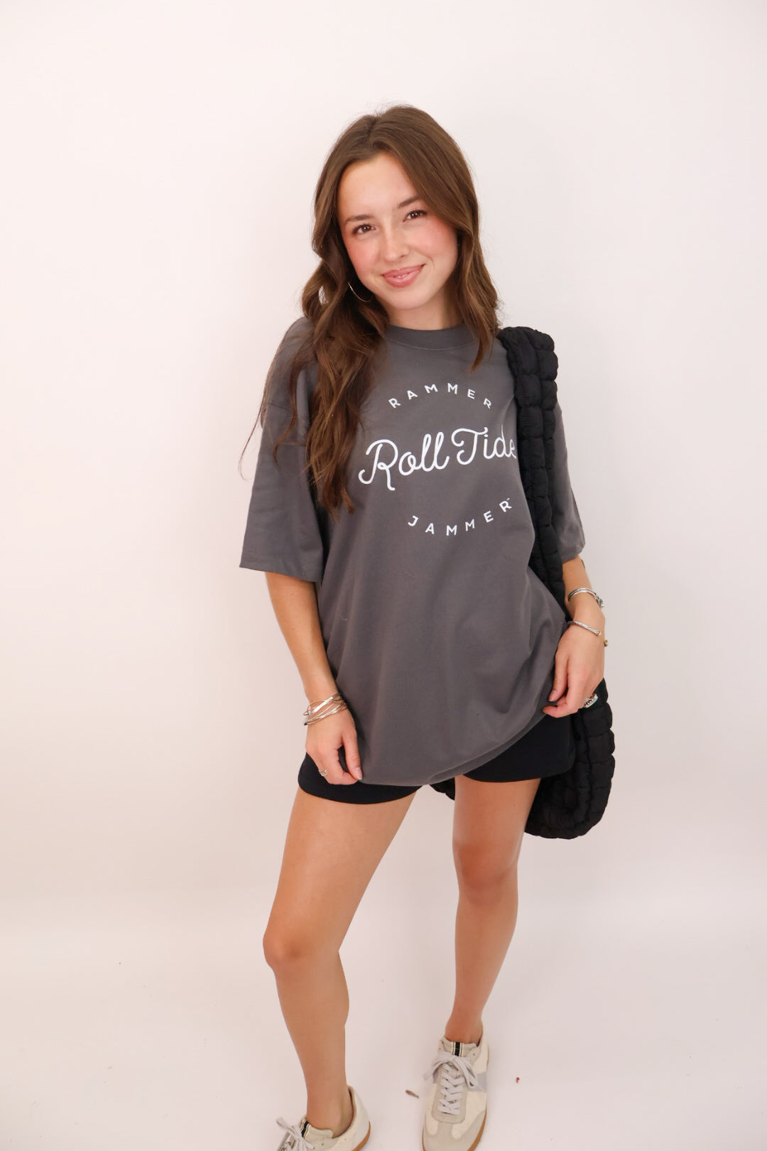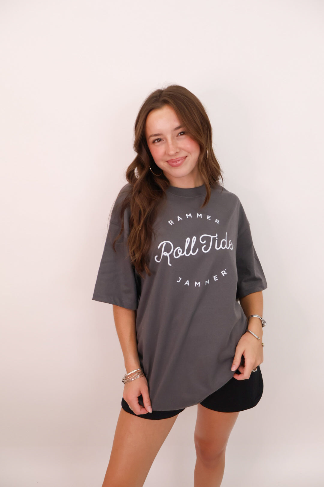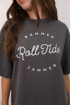 Cue the fight song — this one’s made for loud chants and legendary tailgates. Our Rammer Jammer Tee in charcoal features ‘Roll Tide’ in the center with Rammer Jammer curved around it in crisp white. Made on a soft oversized tee, it pairs perfectly with our relaxed joggers for a game day outfit that brings the energy and the comfort.