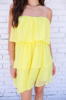 yellow strapless mini dress, chiffon tiered dress, ruffle mini dress, strapless sundress, summer yellow mini dress, flowy strapless dress, lightweight dress for summer, summer soirée outfit
