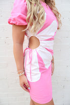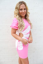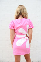 pink daisy cutout dress, fun summer mini dress, floral graphic dress, bold printed dress for sorority rush, puff sleeve pink dress, trendy poplin cutout dress, girly pink dress for summer