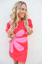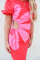 Say hello to your new go-to for standing out in a crowd. The Daisy Pop Cutout Mini Dress is here to steal hearts with its bold oversized daisy print and eye-catching side cutout. Designed in a bold red cotton poplin with contrasting pink petal accents, this mini is both sweet and sassy—just the way we like it. The ruched cutout at the waist creates a flattering cinch, while the puff sleeves add just enough volume to make it feel elevated. From recruitment events to birthday brunches and everything in between, this dress brings the fun wherever you go.