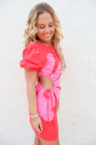 red daisy cutout dress, fun summer mini dress, floral graphic dress, bold printed dress for sorority rush, puff sleeve red dress, trendy poplin cutout dress, girly red dress for summer