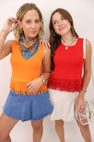 Game day just got a major style upgrade with this orange sweater tank featuring a fun fringe hem! The sleek, fitted knit body is balanced by the playful texture of the fringe, making it the perfect piece to dress up jeans, skirts, or shorts. The sleeveless cut keeps you cool, while the high-quality knit feels luxe and comfortable.