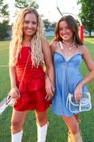 Get ready to steal the spotlight in the Strapless Tiered Poplin Mini Dress — your go-to dress for game day, rush, and every celebration in between. This flirty little number features a structured strapless bodice that hugs in all the right places, with subtle ruching on the sides for a flattering fit. The tiered ruffle skirt adds a playful twist, bringing volume, movement, and total main character energy.