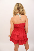 crimson strapless dress, red ruffle mini dress, gameday dress for Alabama fans, SEC tailgate outfit, college rush dress, flirty mini dress southern boutique, Bama game day look, cute red dress for party, tiered strapless mini dress, Alabama gameday outfit inspo