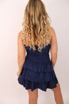 navy strapless dress, navy ruffle mini dress, gameday dress for Auburna fans, SEC tailgate outfit, college rush dress, flirty mini dress southern boutique, Auburn game day look, tiered strapless mini dress, Auburn gameday outfit inspo