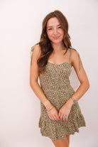 leopard print mini dress, fall date night outfit, tiered hem dress, sweetheart neckline dress, boutique fall dress, ruffle mini dress, adjustable strap dress, trendy animal print outfit, leopard print fall mini dress