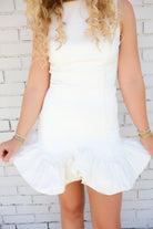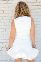 white ruffle mini dress, bridal shower dress, graduation dress, rush dress, recruitment dress, high neck white dress, fitted white mini, statement hem dress, white summer party outfit, bride-to-be dress