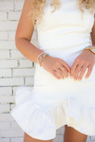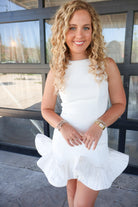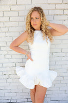 She's structured, she's sassy, and she twirls like a dream. This white mini dress features a sleek, high neckline and a curve-hugging fit through the body, finished with a playful ruffle hem that brings the drama in the best way. It’s clean and modern with just the right amount of fun—making it the ultimate pick for showers, graduation, or a fancy girls’ night out.