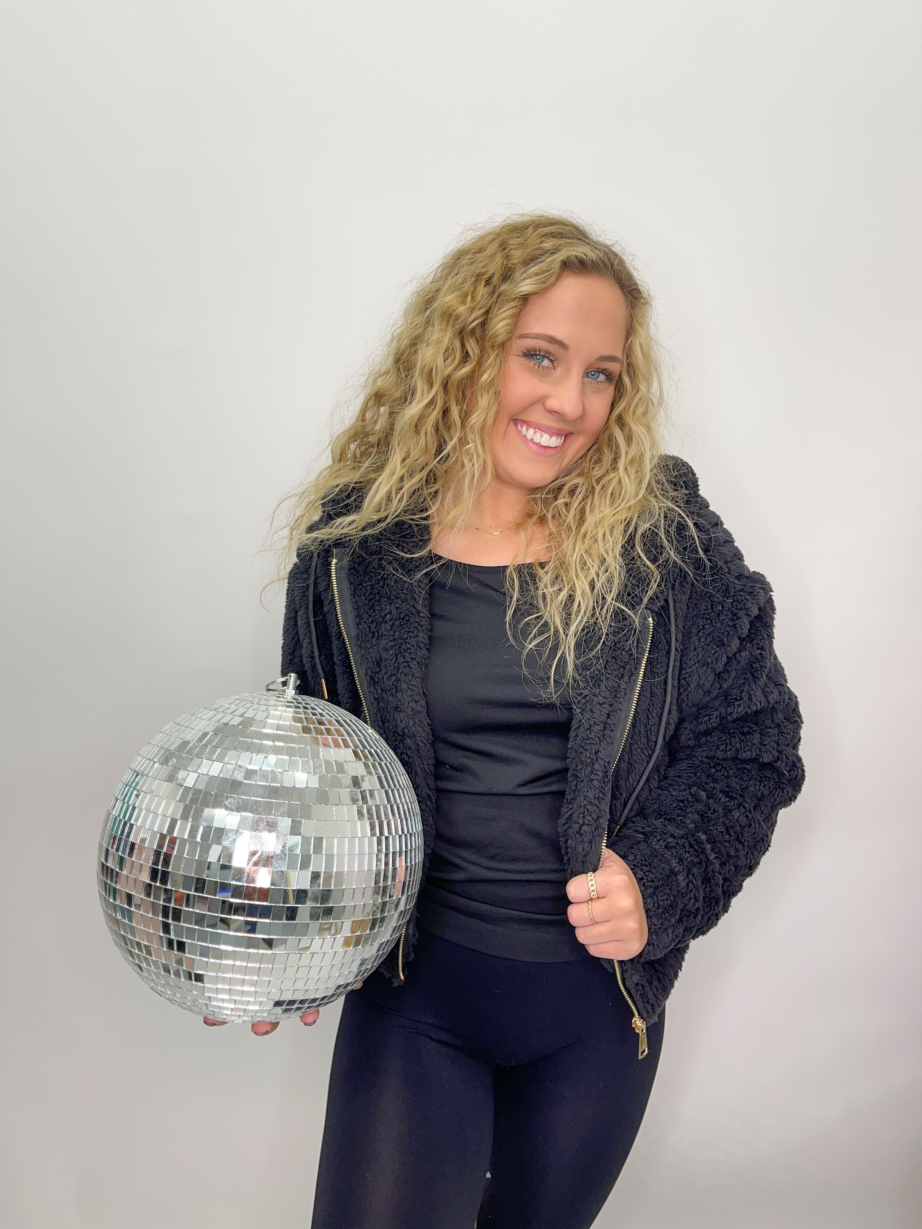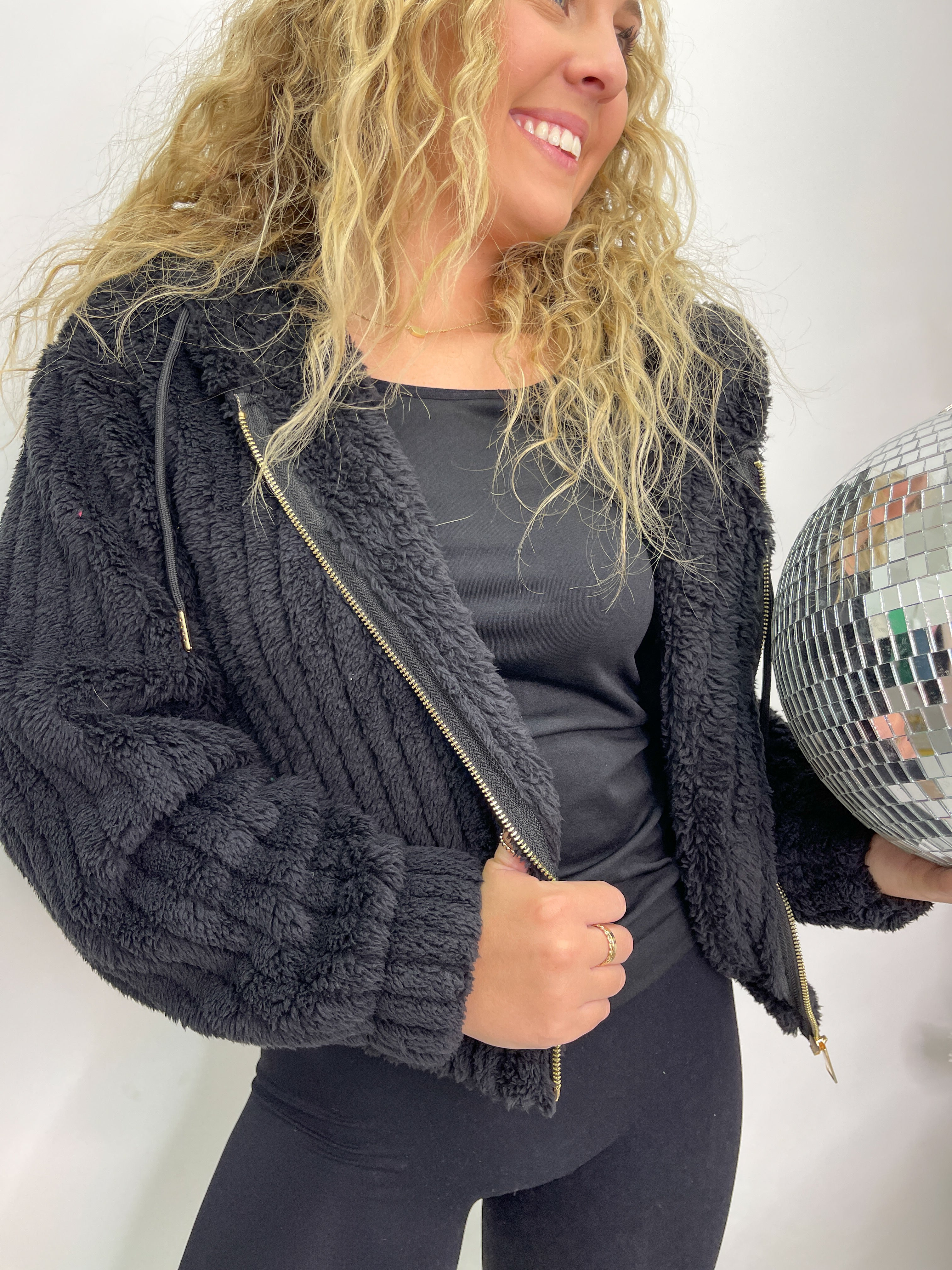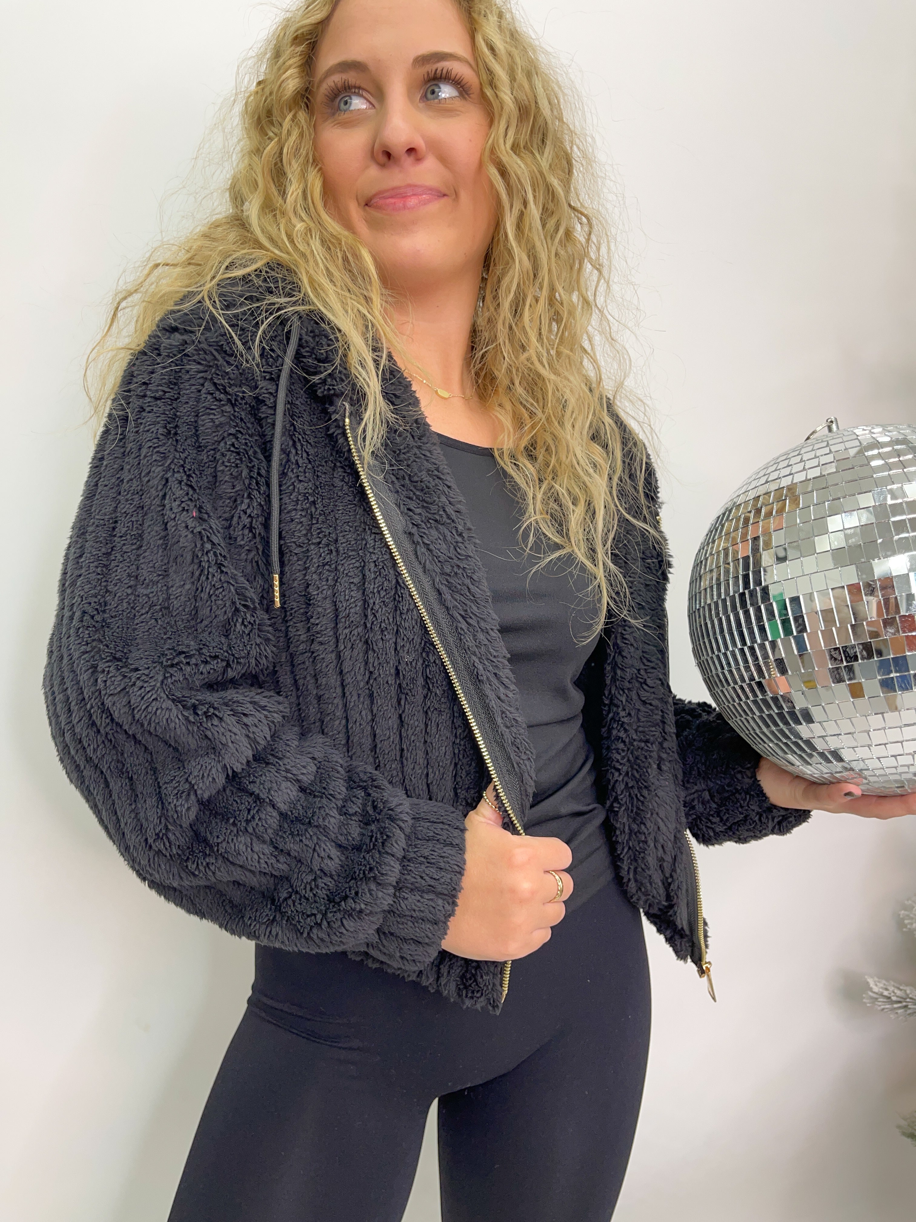 Hooded Ribbed Sherpa Jacket - Black