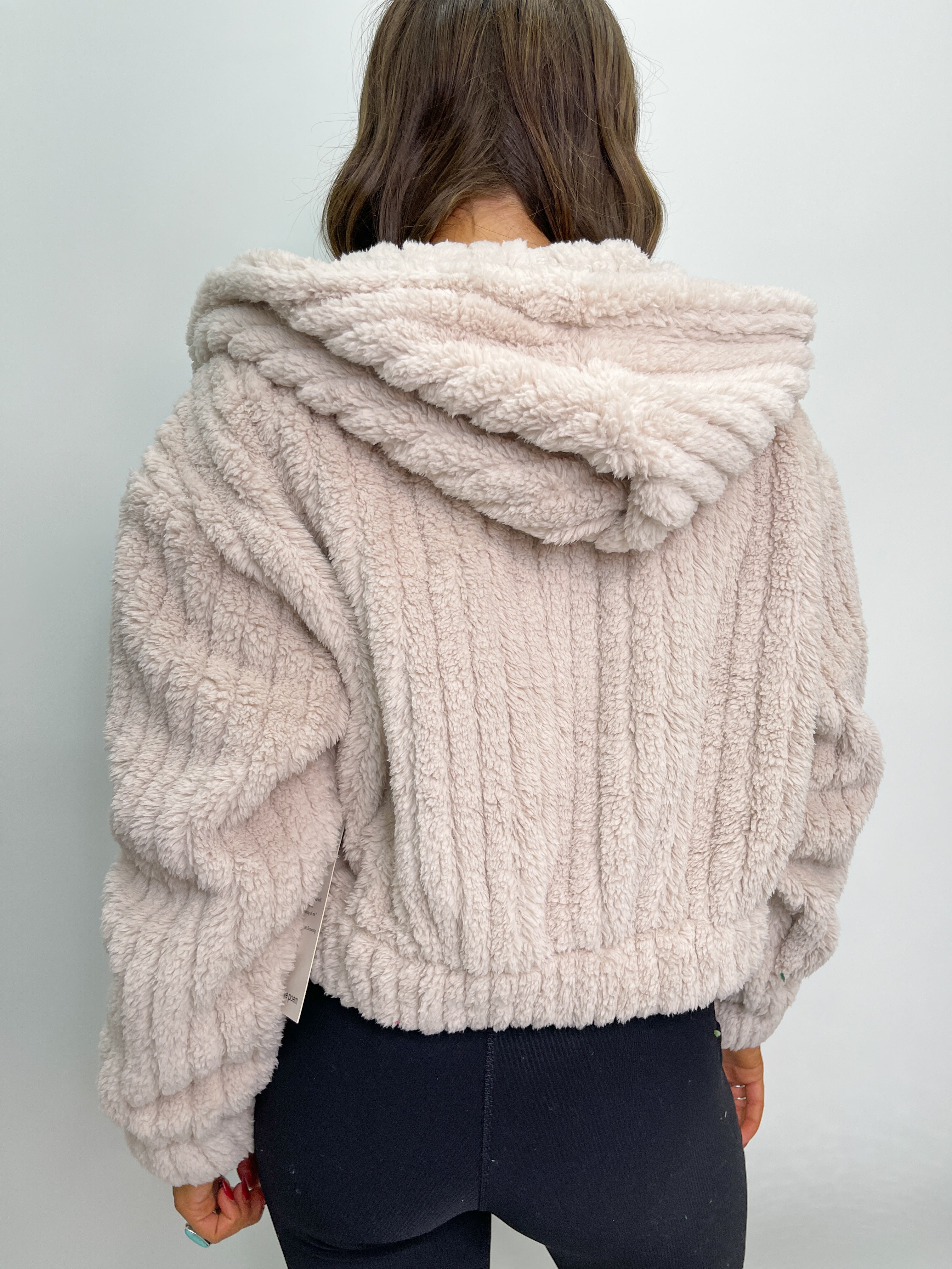 Hooded Ribbed Sherpa Jacket - Cream Pink