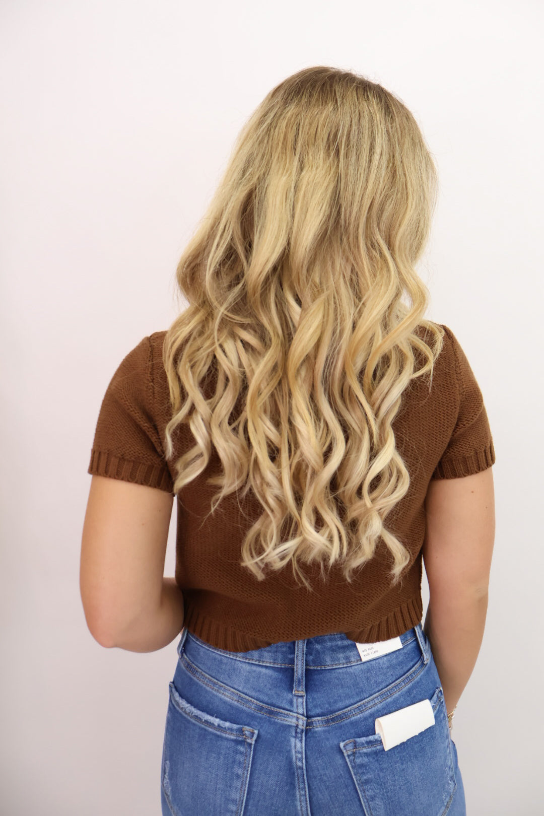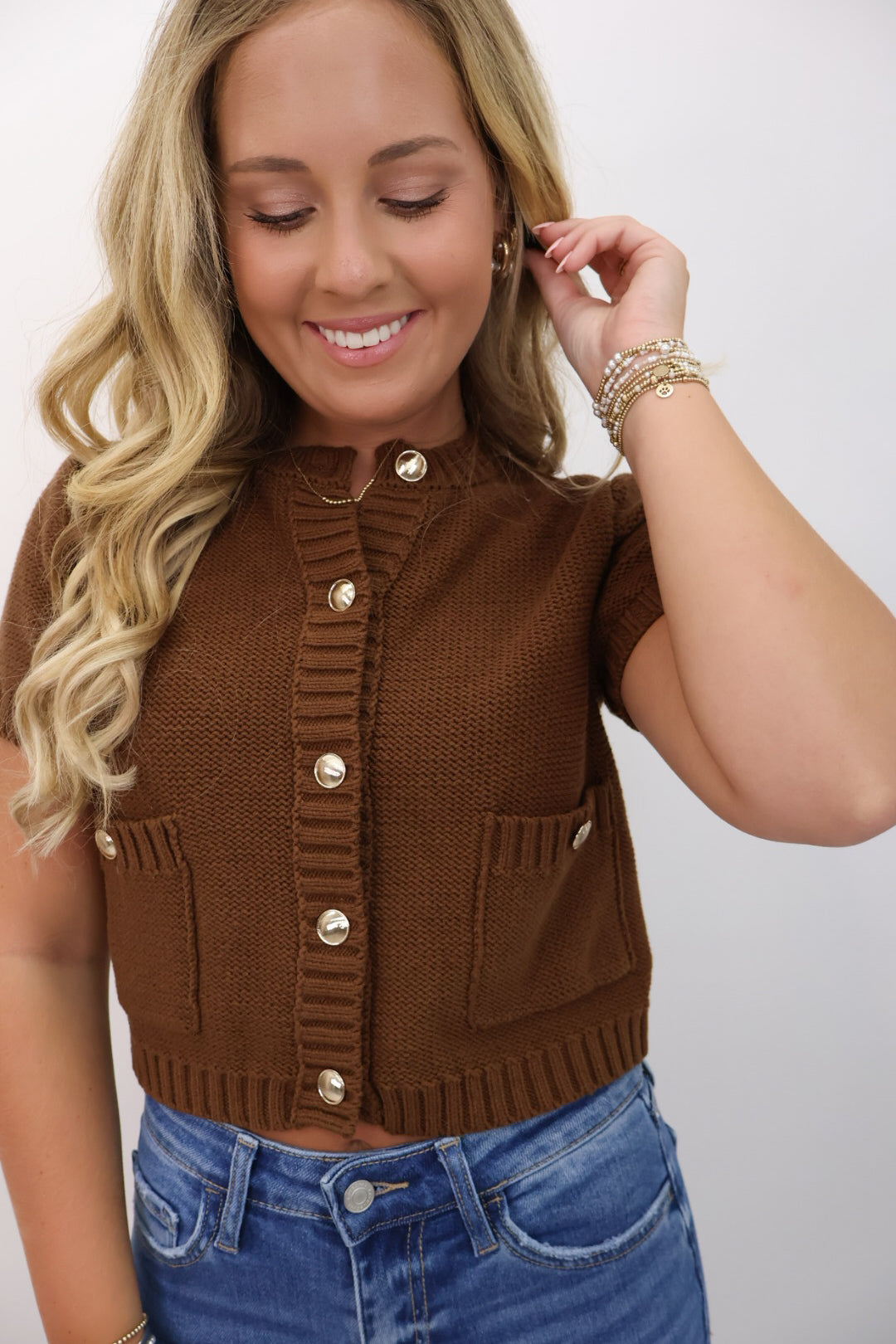 Gold Button Front Knit Cardigan Top - Chocolate Brown