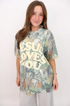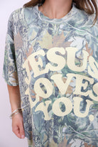 Jesus Loves You camo tee, oversized graphic tee, Christian faith shirt, camo print Jesus shirt, casual faith-based graphic tee, inspirational t-shirt women, Jesus loves you tee