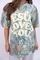 Bring faith and fashion together with this bold statement tee. The camo print gives it that edgy, laid-back vibe while the oversized “Jesus Loves You” graphic keeps the message front and center. Designed with a relaxed fit, it’s the perfect tee to pair with denim cutoffs, leggings, or layered under a jacket for an easy everyday look. Whether you’re lounging at home, heading to class, or running errands, this tee is the reminder we all need—and the one everyone else will see, too.