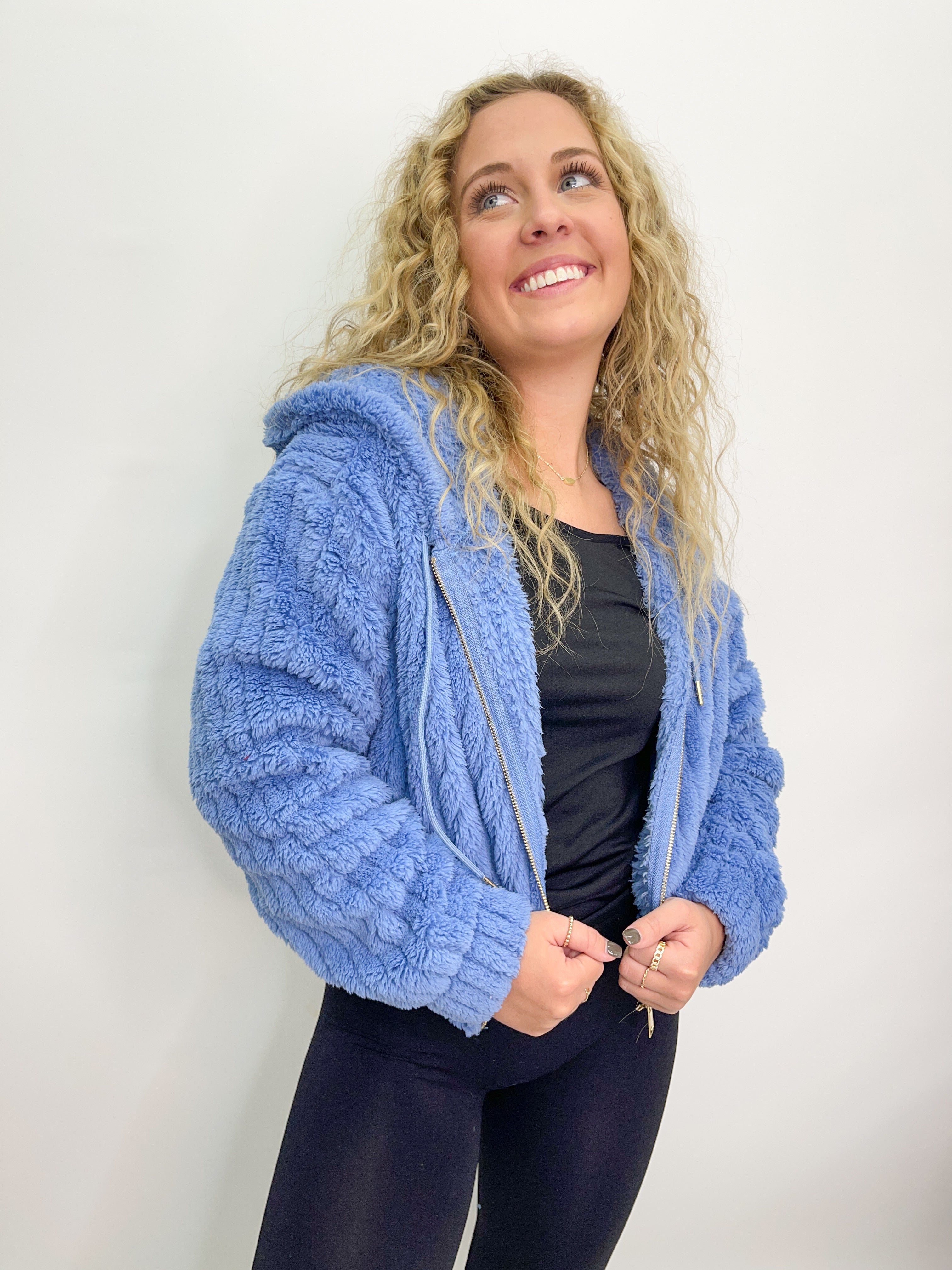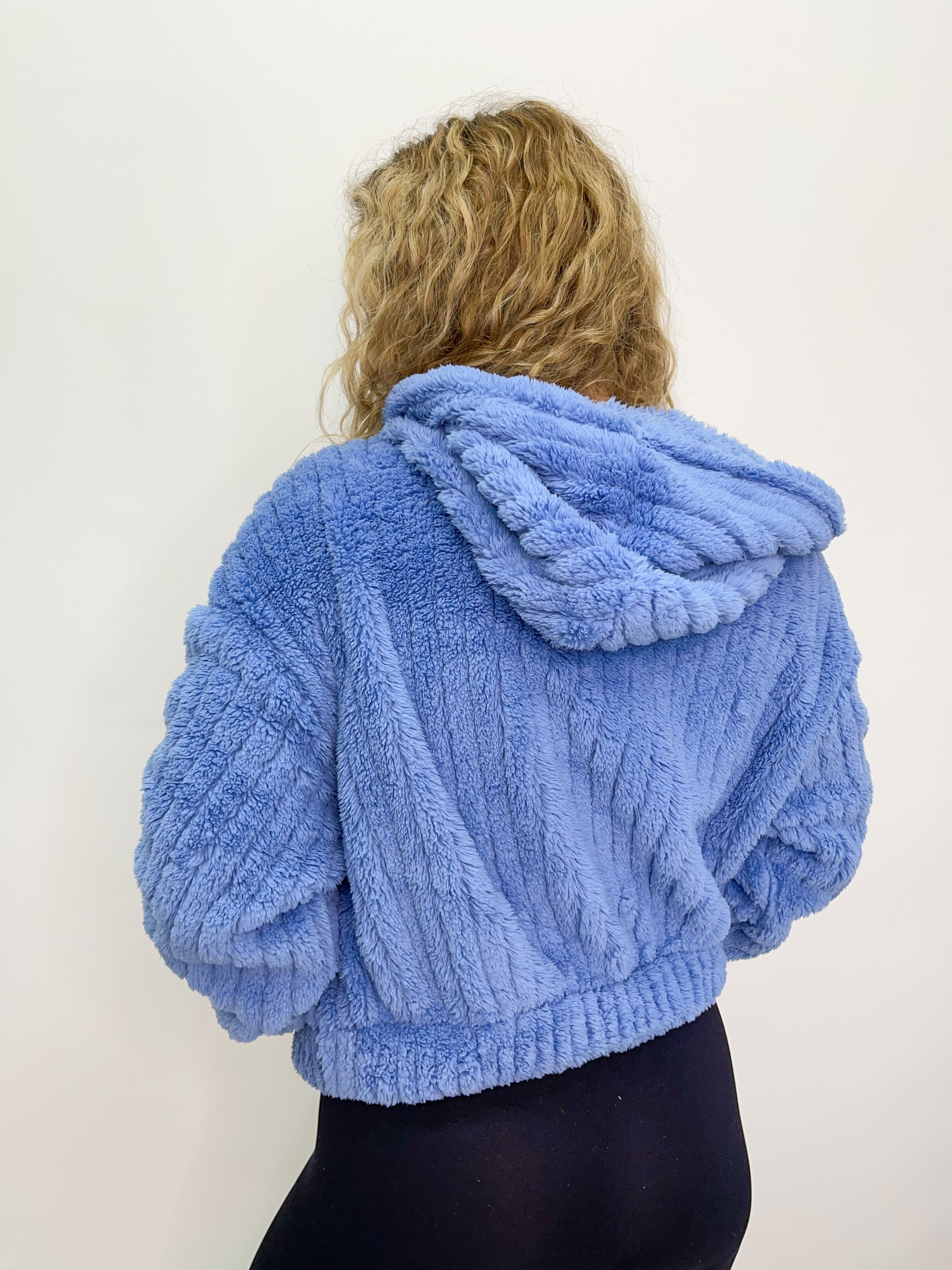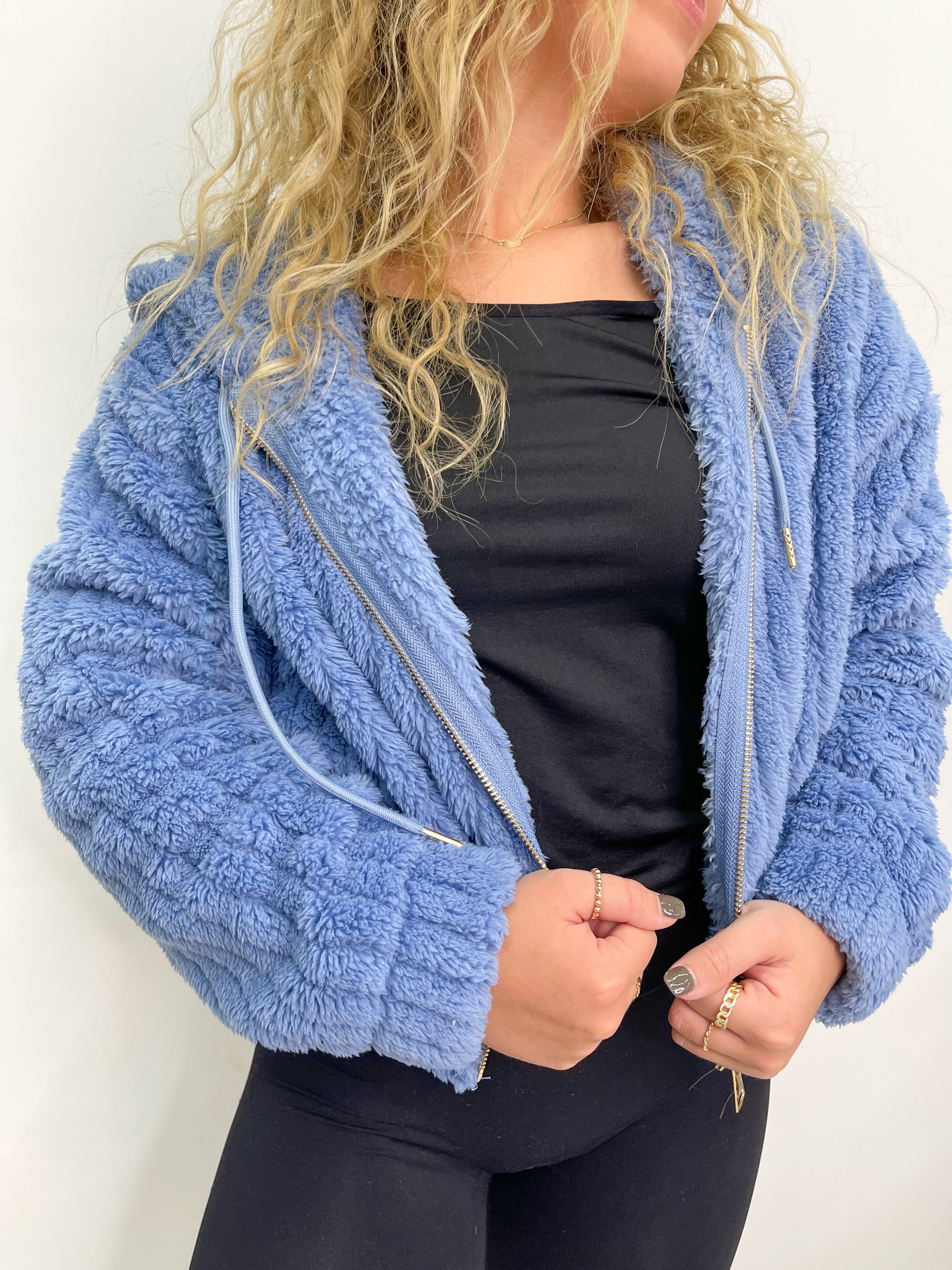 Experience the luxurious comfort and warmth of our ribbed sherpa jacket! Featuring a soft ribbed texture, a stylish hood, and a gold zippered front, this jacket is perfect for any occasion. Dress it up or down for a versatile and chic look. Stay cozy and fashionable all season long!