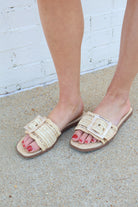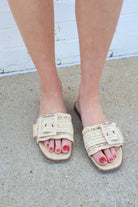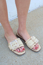 These chic and stylish sandals are perfect for effortlessly elevating your warm-weather wardrobe! Featuring a textured woven design with a bold statement buckle, these sandals offer a laid-back yet sophisticated vibe that complements any casual outfit. The slip-on style ensures ease of wear, while the comfortable flat sole provides support for all-day walking. Whether you're lounging by the pool, running errands, or enjoying a sunny day out, these sandals will keep your feet cool, comfortable, and on-trend.
