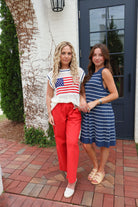 This vibrant navy and white striped dress features a soft ribbed knit texture and a swingy A-line shape that’s both flattering and comfortable. It’s sleeveless, high neck, and made for those sunny days when you want to feel put together without trying too hard.