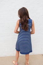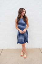 navy striped summer dress, knit tank dress, sleeveless ribbed dress, coastal striped dress, boutique summer dress, Nantucket inspired style, casual navy dress, swing knit dress